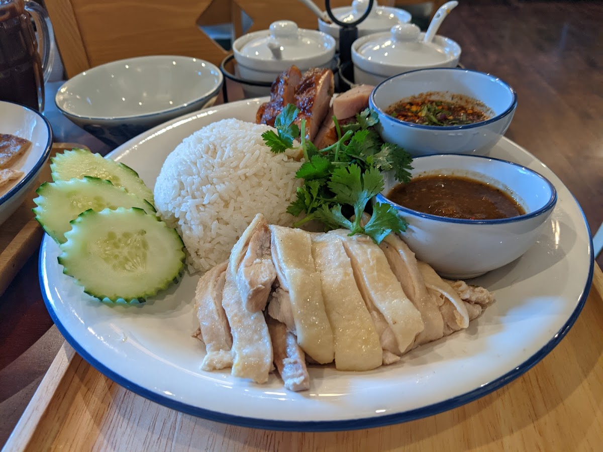 I think my friend was raving about the place a while ago so I had this place in my mind for quite some time. I had a free afternoon on a weekday so I decided to try it on a whim. It took me this long to go there because I'm never in the area and I'm usually not too psyched about taking the bus to an unfamiliar place. But I'm glad I did it!! I had the combination of simmered chicken and grilled chicken with the usual rice, cucumber, and some sauce. This was probably the best khao man gai I had in the US. I wasn't keen on some of the khao man gai I had elsewhere because they are sometimes too fatty/heavy or the meat is too dry. But this restaurant did it perfectly. Chicken pieces were tender and not dry at all and the dish was not too heavy that I could continue eating for a long time. It's a pretty generous portion so I didn't finish eating in one sitting. I saw on the menu that this dish is medium spicy, and knowing how Thai spicy can get deadly at times, I was a little cautious -- but it was absolutely nothing to worry about. One sauce was spicier than the other one but it was still barely spicy. I like my khao man gai not spicy, so I appreciated that. I had no idea how long the trip home was going to be, so I just ordered takeout this time. But there was a warm atmosphere at the restaurant and the guy taking order was welcoming and polite. I would love to dine in next time. I also saw green curry in the menu and wonder if that would be good too.
